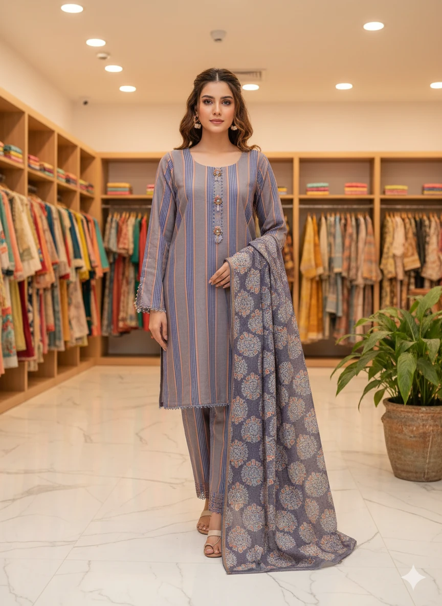 House of Crescent presents a serene aqua mint unstitched lawn ensemble. The shirt features unique geometric frame prints with delicate floral centers. It comes with a matching printed dupatta and plain trousers, offering a perfect blend of modern aesthetics and ethnic charm.