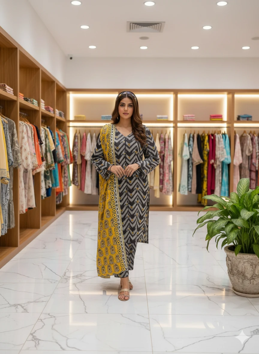 Stand out with this striking unstitched ensemble from House of Crescent. The charcoal grey shirt and trousers feature a bold, modern zig-zag (Ikat style) pattern in monochrome tones. To add a vibrant contrast, it is paired with a beautiful mustard-yellow printed dupatta with traditional motifs. This lightweight lawn suit is a perfect choice for women who love a blend of contemporary patterns and classic colors.