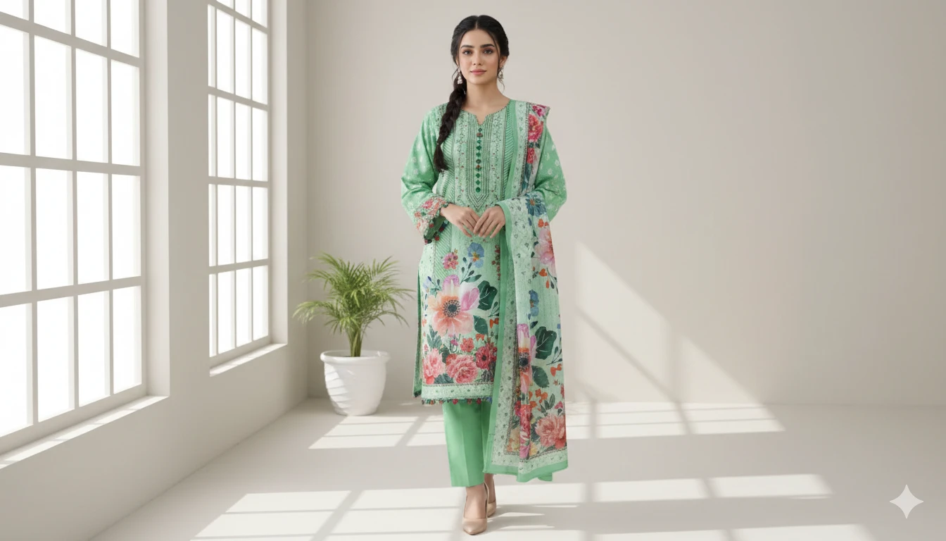 House of Crescent presents a serene mint green unstitched lawn ensemble. The shirt features unique geometric frame prints with delicate floral centers, complemented by a sophisticated black and gold patterned border. Paired with a soft printed dupatta and plain trousers, this outfit is a perfect blend of modern design and traditional grace.