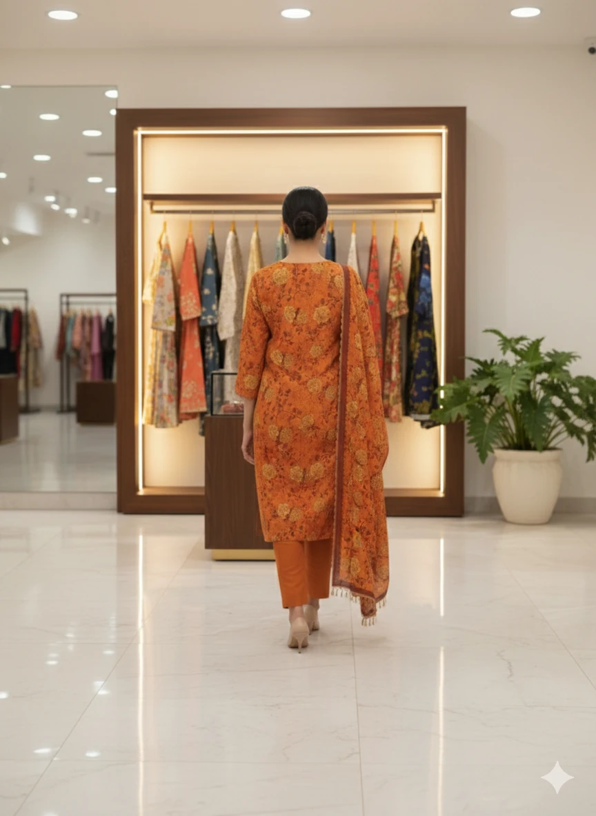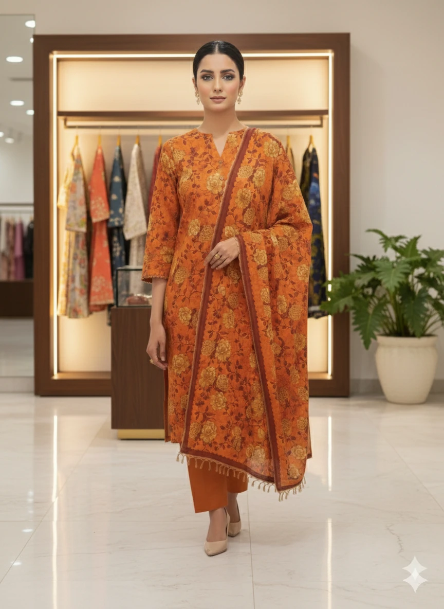 House of Crescent presents a masterpiece in rust orange. This unstitched lawn suit is covered in a rich, all-over golden floral print that exudes warmth and sophistication. The dupatta features a matching heavy floral pattern with a delicate fringed border, paired with solid rust trousers to keep the look balanced and elegant. A timeless choice for any season.