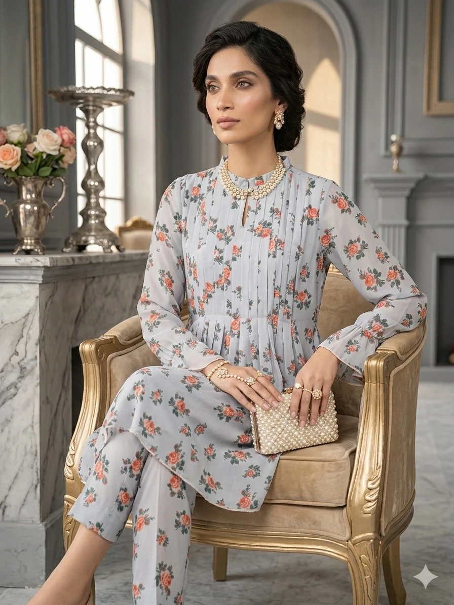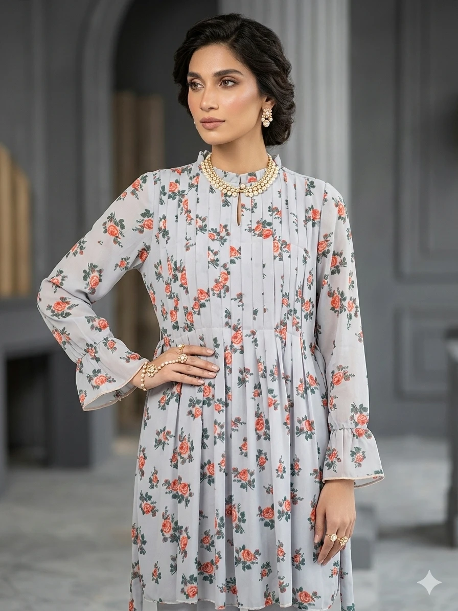 Enhance your wardrobe with this elegant grey floral women shirt, designed for women who love graceful and timeless fashion. The shirt features a beautiful rose floral print on a soft grey base, creating a refined and feminine look.