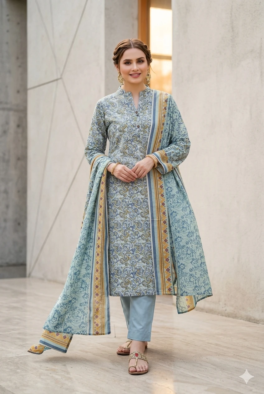 Enhance your wardrobe with this beautifully designed sky blue 3-piece unstitched lawn suit. Crafted with premium quality lawn fabric, this outfit features a delicate all-over print on the shirt paired with a matching dyed trouser and a stylish printed dupatta with elegant borders.