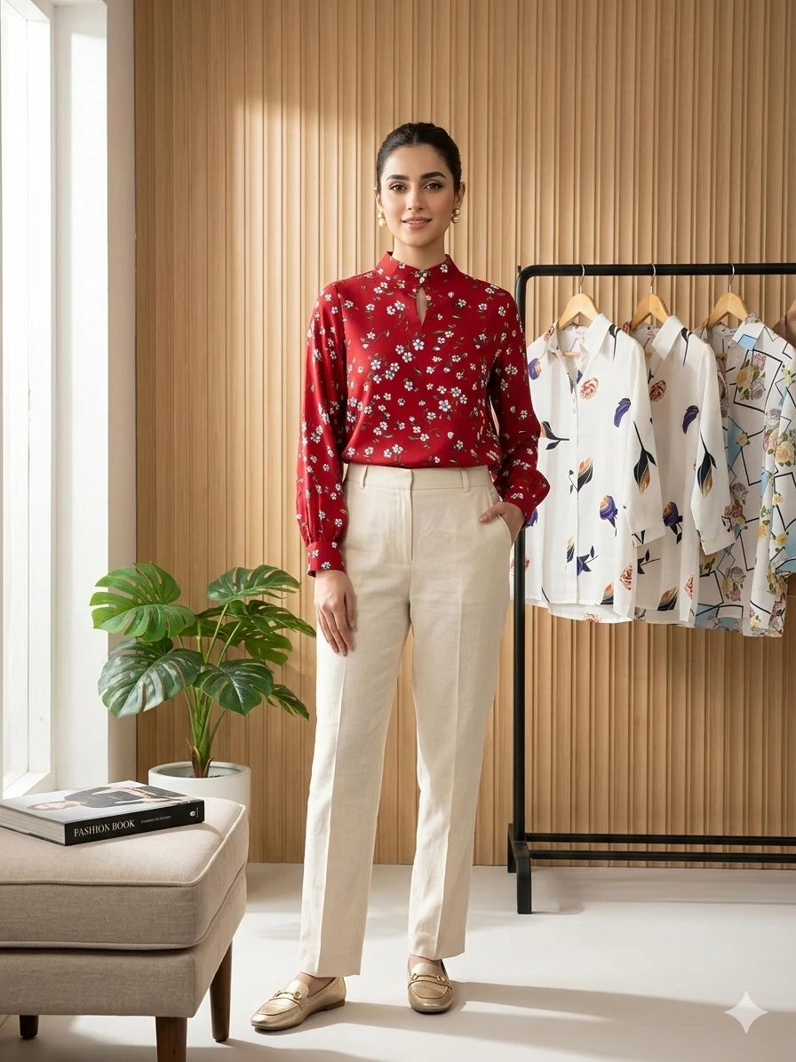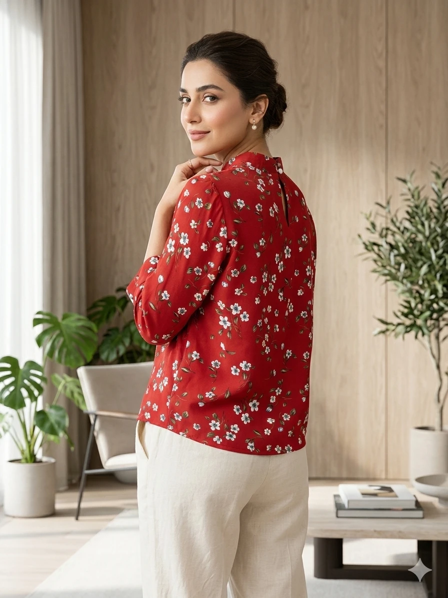 Add a vibrant touch to your wardrobe with this elegant red floral printed women’s shirt. Designed with a graceful floral pattern on a rich red base, this shirt offers a perfect blend of modern style and comfort.