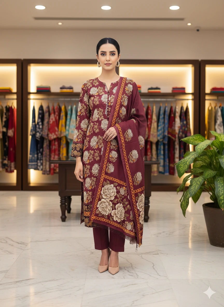 This elegant maroon floral 3 piece suit is designed for modern women who love traditional style with a classy touch. The beautiful floral pattern and detailed dupatta border enhance its overall look, making it perfect for gatherings, dinners, and everyday wear.