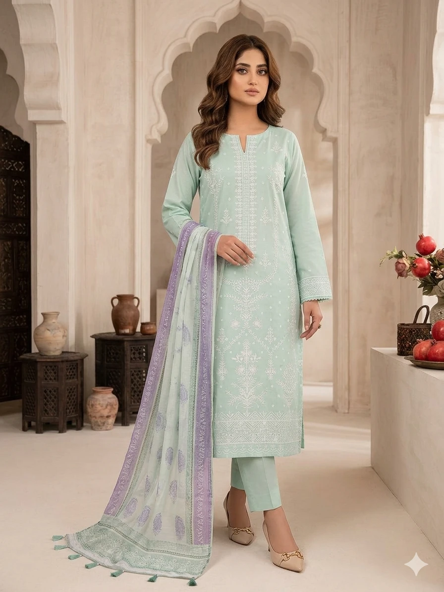Refresh your wardrobe with this beautifully designed mint green unstitched 3-piece suit, crafted for a soft and graceful look. The shirt features delicate embroidery with intricate patterns that enhance its subtle elegance.