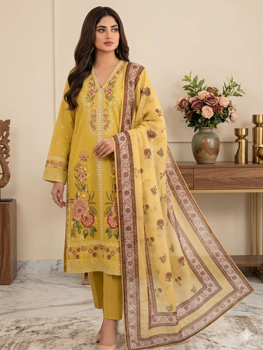 The shirt is adorned with intricate floral patterns that add a touch of femininity, while the matching dupatta showcases a detailed border design, enhancing the overall charm. Paired with a plain dyed trouser, this ensemble creates a balanced and polished appearance.