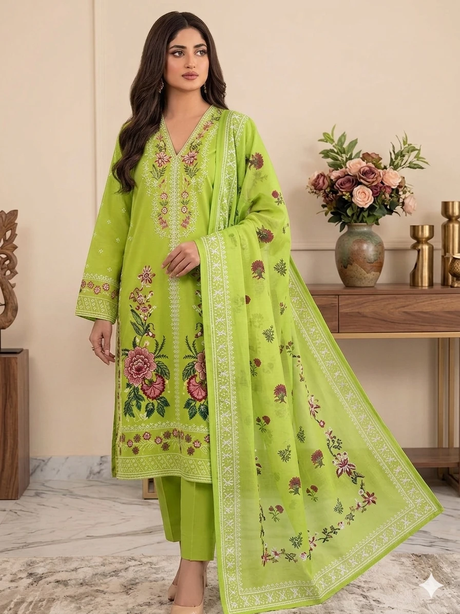 The rich mustard tone is enhanced with intricate multicolor prints, giving it a fresh and lively appeal. Paired with a matching dyed trouser and a gracefully printed dupatta with detailed borders, this ensemble is perfect for everyday wear and casual gatherings.