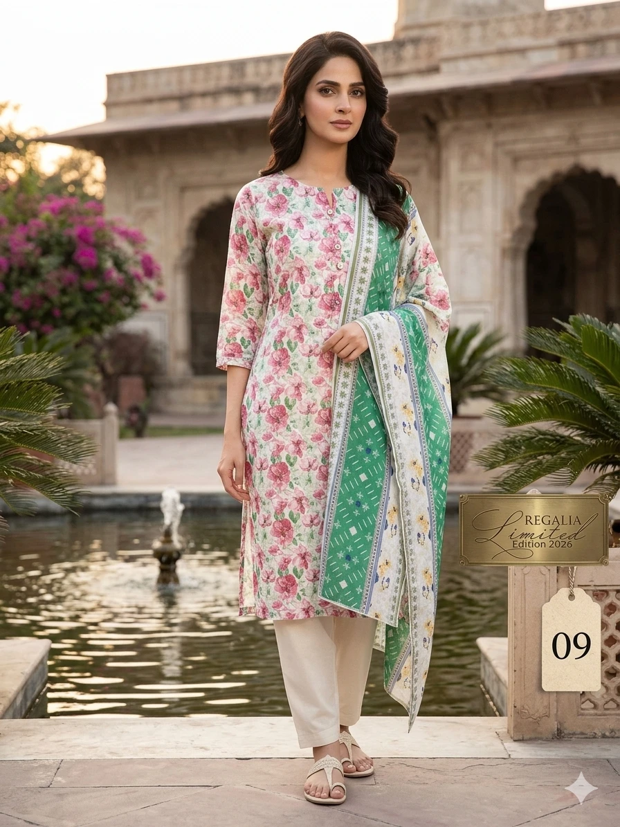 House of Crescent pesh karta hai apna naya Regalia Limited Edition 2026 collection ka ek nihayat haseen jora. Is dress mein khubsurat pink floral prints hain jo green aur white accents ke saath mil kar ek fresh look dete hain. Iske saath matching printed dupatta aur comfortable off-white trousers diye gaye hain, jo garmiyon ke liye behtareen hain.